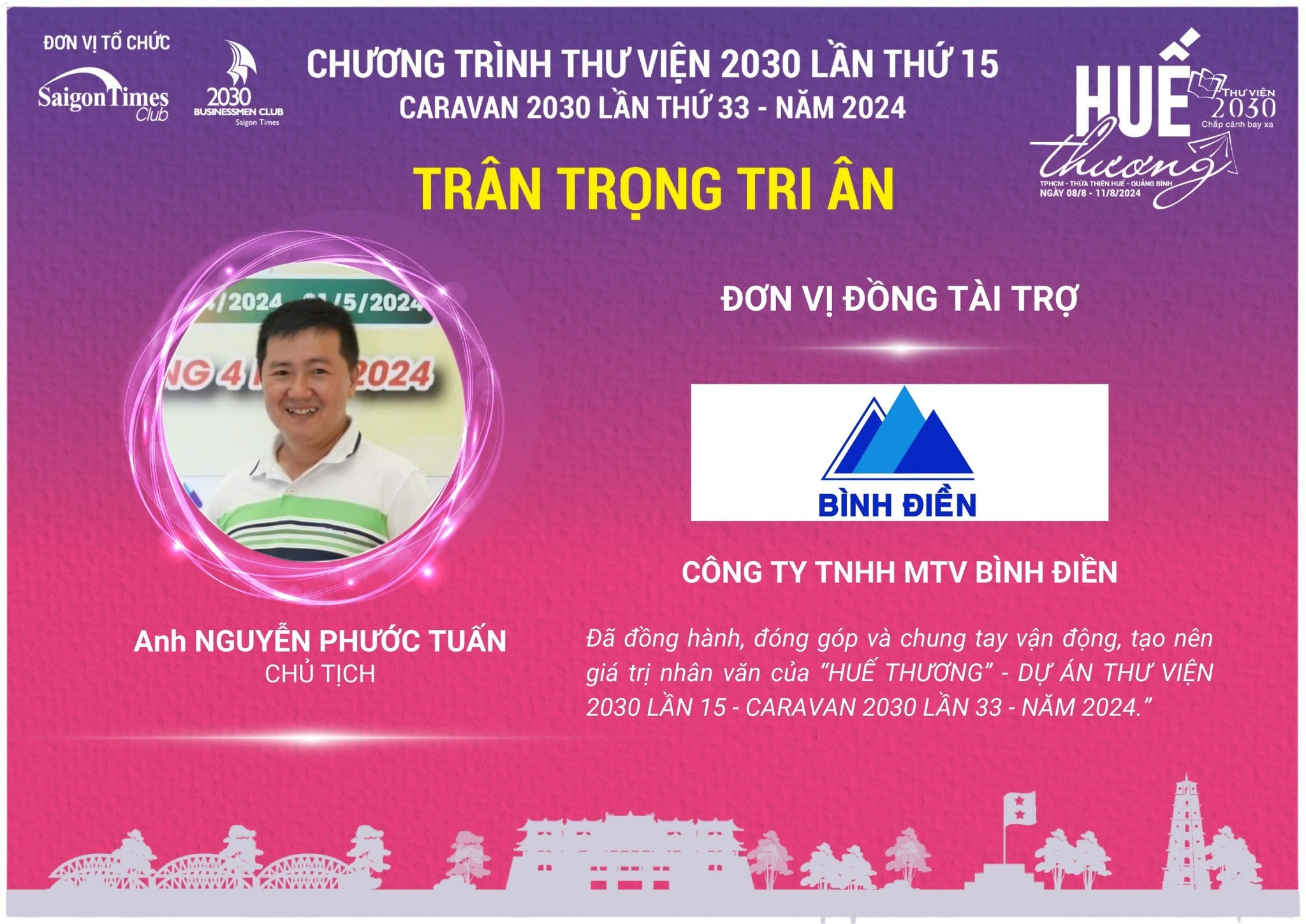 Ban Chấp Hành CLB Doanh Nhân 2030 – BTC Chương trình Caravan “Huế Thương!” xin trân trọng tri ân sự đồng hành và yêu thương của Chủ Tịch – NGUYỄN PHƯỚC TUẤN cùng Công ty TNHH MTV Bình Điền, xin kính chúc Anh nhiều sức khỏe, quý Công ty ngày càng phát triển vững mạnh!